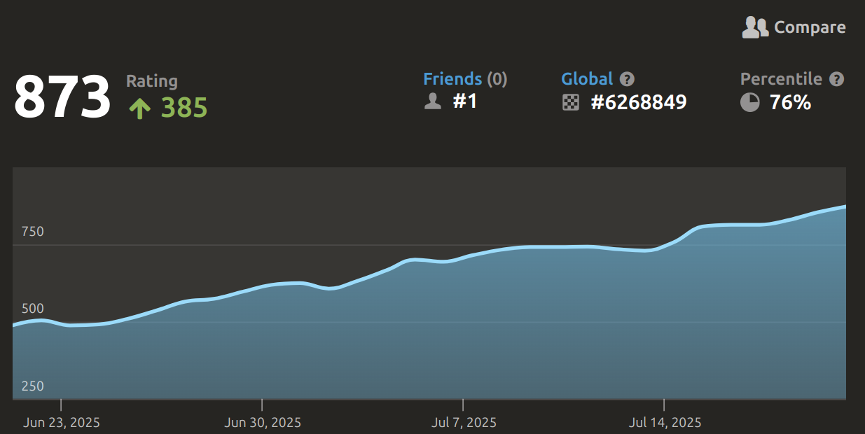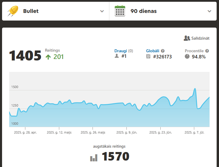 vvv Posted July 20 Share Posted July 20 Šad tad uzspēlēju, nenopietni, ar apdomas laiku 1 minūte spēlē katram spēlētājam, bez sekunžu pielikšanas pēc katra gājiena... Rokas veiklība izšķiroši... A kas? Reitings staigā, tieši bullet spēlēs tā, no 1200 līdz 1500 un vairāk... Bieži sanāk zaudēt laika trūkuma dēļ, jo man lēns internets, mēdz iebremzēt. Nopietnām spēlēm, ar ilgu domāšanas laiku nesanāk laika Link to comment Share on other sites More sharing options...