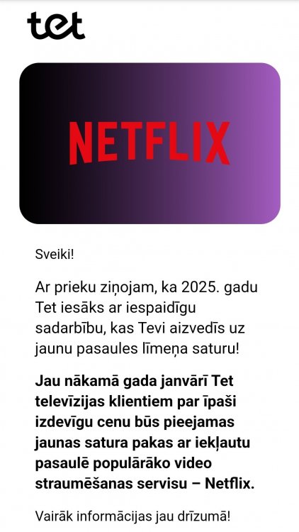 base7 Posted January 9, 2024 Share Posted January 9, 2024 Izskatās, operators Baltkom no sava saraksta izmetis TV kanālu "DocuboxHD". Savukārt paketi papildinājis TV kanāls "Setanta Sport 2 HD". Starp citu, "Setanta Sport 1 HD" jau sen ir piedāvājumā. Link to comment Share on other sites More sharing options...