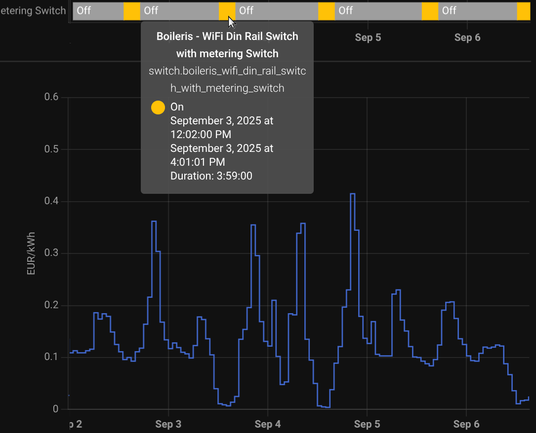 defs Posted January 14, 2024 Author Share Posted January 14, 2024 Pirms 25 minūtēm , AndrisBB teica: Nu tad loģisks secinājums no šā visa ir ka no sākuma vajag programmu kas izrēķina optimālus laikus. T;al;ak jau pateikt boilerim/rozetei kad ieslēgties/izslēgties elementāri. Tos datus var dienu iepriekš redzēt https://nordpool.didnt.work/ Pirms 21 minūtēm , AndrisBB teica: Vēl nebūtu slikti no boilera iegūt pašreizējo temeratūru, lai var piekoriģēt algoritmu. Boileris tikai kā 1 piemērs. Ja tiek ar to skaidrībā, tad var darīt visu, kas ienāk prātā. Tā kā speciāli uz boileri neieciklējamies. Svarīgi ir, kad mainās cena uz augšu vai leju no uzstādītās, tad nostrādā relejs. Ko tam katrs slēdz klāt-tas katra paša ziņā. Kaut vai cena lejā, neviens nav mājās, ar elektrību sildīt telpas. Link to comment Share on other sites More sharing options...