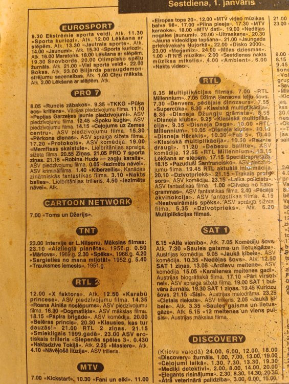 base7 Posted November 18 Share Posted November 18 Uz Astra (19.2E) satelīta esošais FTA telekanāls "3Sat" kā katru gadu vecgada dienā piedāvās dažādu mūziķu koncertus. 31.12.2025 05:55 Pop Around@Bauhaus: MIA 06:55 Pop Around@Bauhaus: LOI 08:00 Pop Around@Bauhaus: Die Fantastischen Vier 09:00 Cypress Hill & London Symphony Orchestra: Black Sunday 10:00 Imagine Dragons & LA Film Orchestra: Live from the Hollywood Bowl 11:15 Pink Floyd: Pulse 13:00 David Gilmour: Live at the Circus Maximus, Rom 14:45 Marius Müller Westernhagen: Live 1989 16:00 Bruce Springsteen: Live in Dublin 17:15 An Evening with Elton John & Brandi Carlile 18:00 Raye: My 21st Century Symphony - Live at the Royal Albert Hall 19:00 Mariah Carey: Daydream World Tour 20:15 Whitney Houston: The Concert for a New South Africa 21:45 Rihanna: Loud - Live at the O2 23:00 Usher: Rendezvous in Paris 01.01.2026 00:25 Simply Red: Live in Santiago 01:30 Sade: Live in San Diego 02:30 Evanescence: Live in Amsterdam 03:30 Iggy Pop: Live at Montreux Jazz Festival 2023 04:45 Electric Callboy: Tekkno Tour '23 - Live in Europe Vācijas laika zona. Stundas starpība ar Latviju! 2 Link to comment Share on other sites More sharing options...